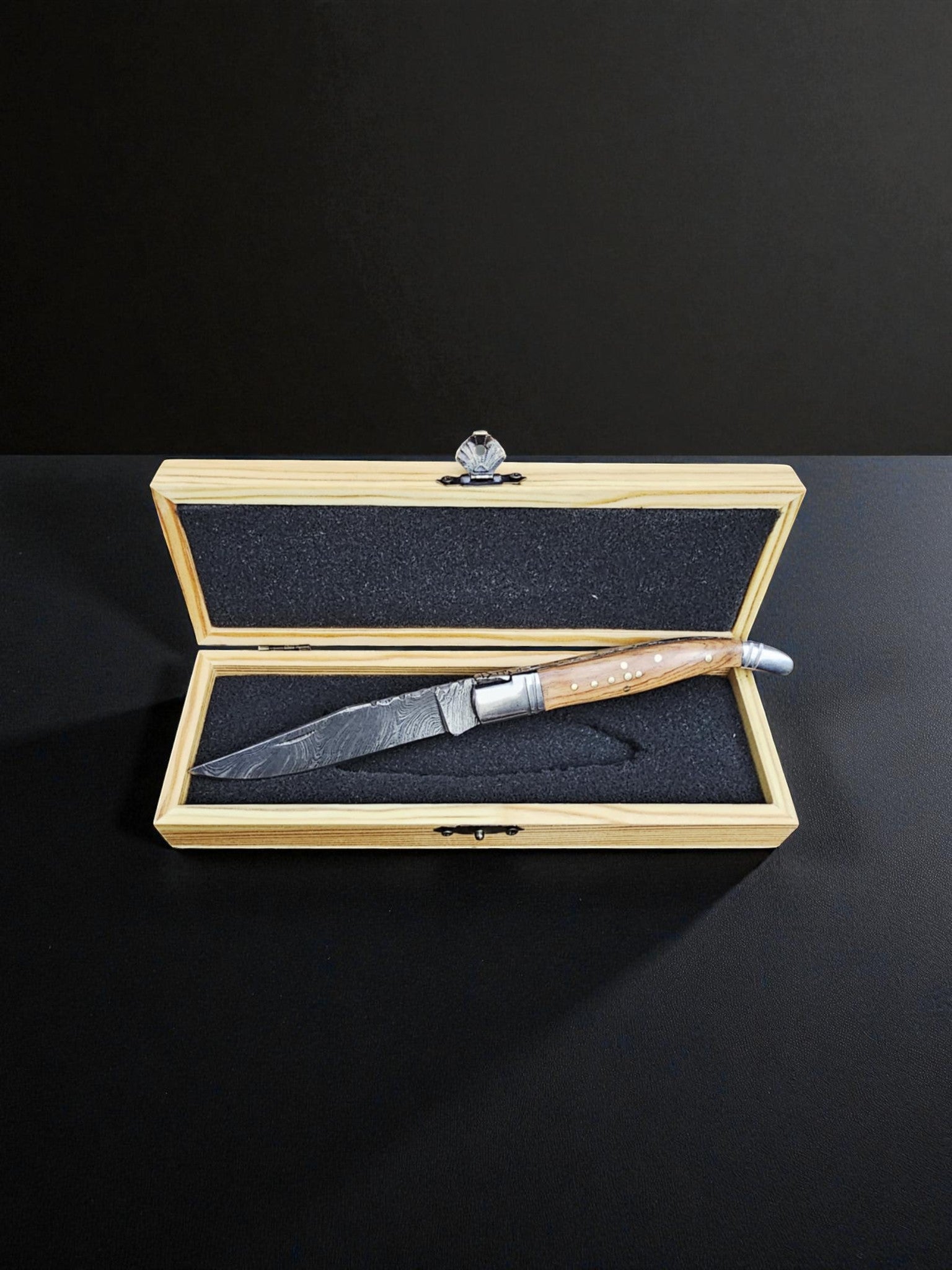 A beautifully crafted handmade Laguiole Rustique (A142 €65) featuring genuine Damascus steel and natural olive-wood scales. Elegant, traditional, and built with exceptional attention to detail.
