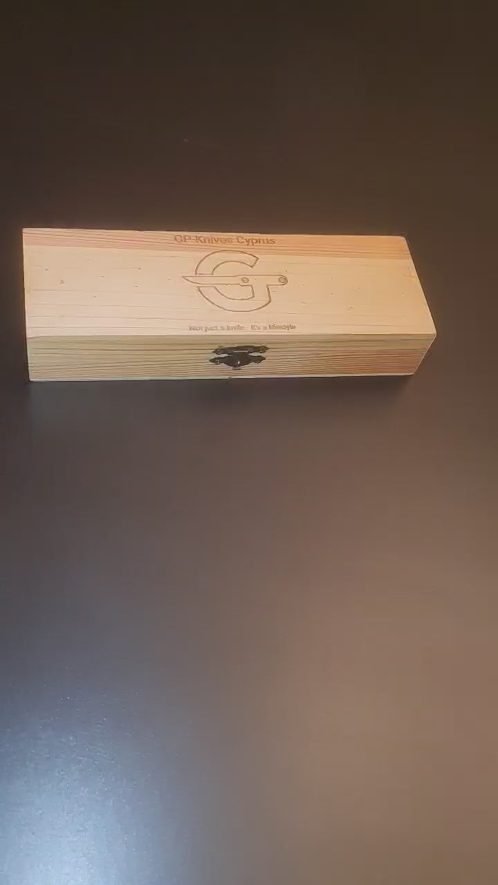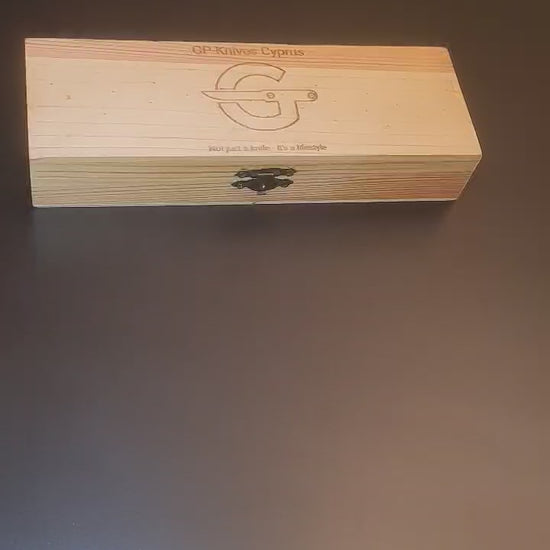 This premium piece comes presented in a hand-crafted wooden gift box (€10) with precision-cut EVA foam (box size: 21×7×4 cm, knife length: 22 cm), making it a complete and impressive gift package.