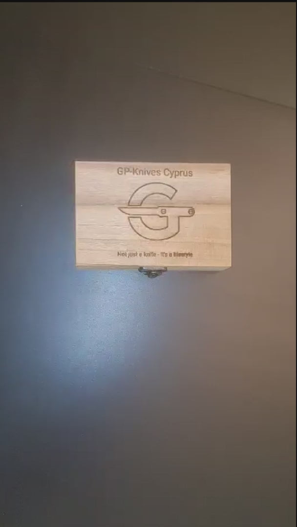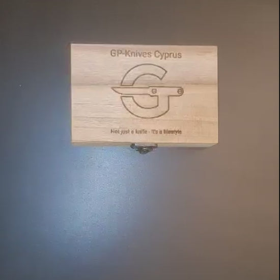 Presented in a hand-crafted wooden gift box (Z001 €10) with precision-cut EVA foam (box size: 15×10×5 cm, knife length: 19 cm), this set arrives as a complete, impressive gift package—perfect for display or gifting.