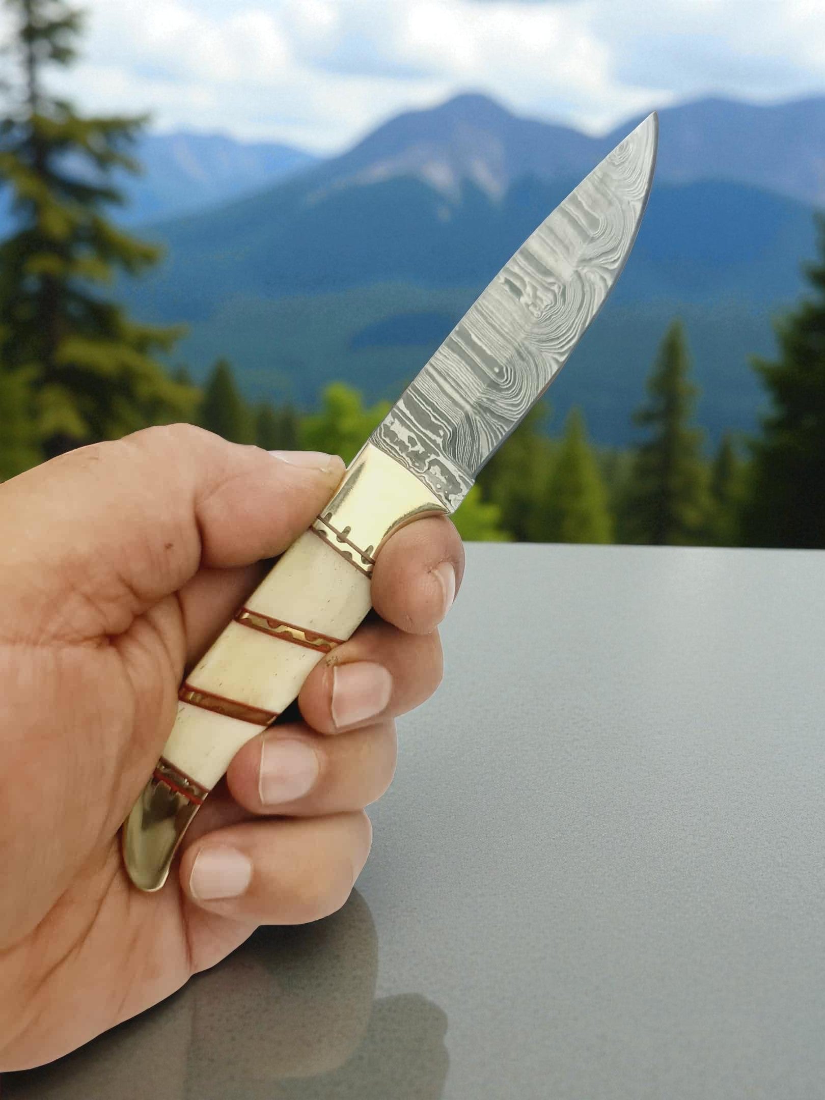 H121 Handmade Mini Hunting Knife - Damascus Steel & Camel Bone