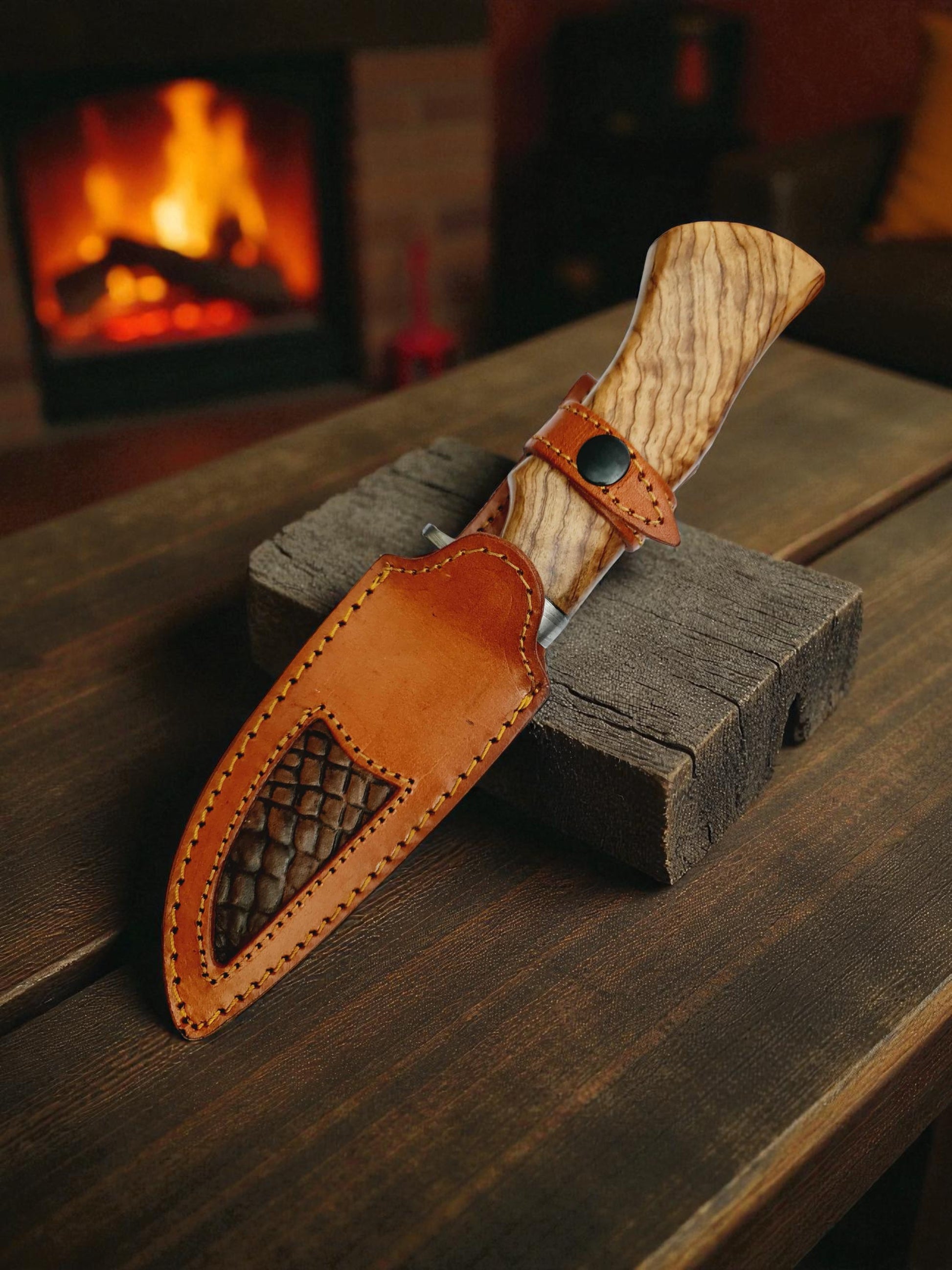 H123 Handmade Hunting Knife - Feather Damascus Steel & Olive wood