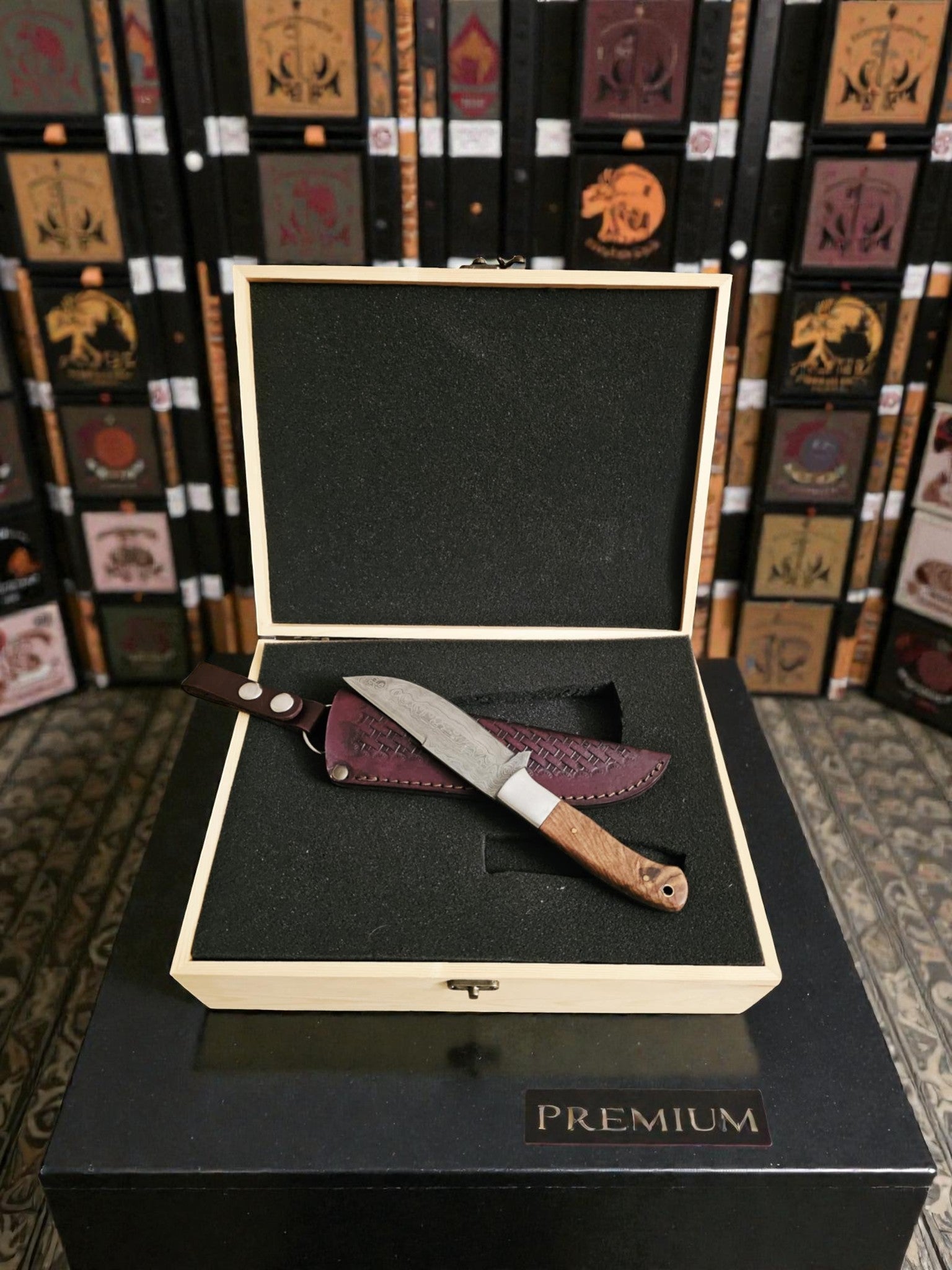 H132G – Handmade Hunting Knife + Leather Sheath & Wooden Gift Box