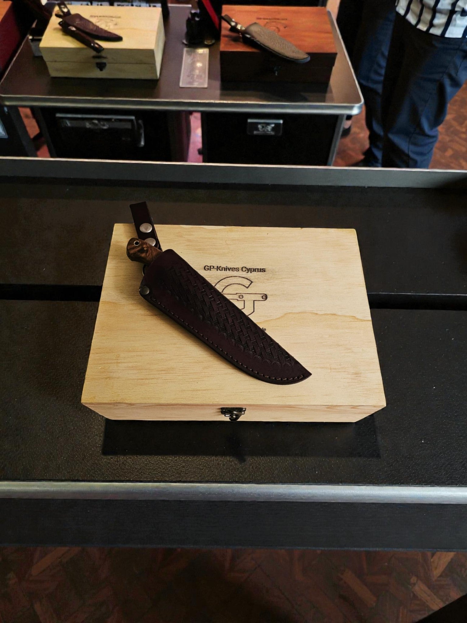 It includes a leather (Free) sheath and comes presented in a hand-crafted wooden gift box (Z002 €30) with precision-cut EVA foam (box size: 30×23×9 cm, knife length: 24 cm), making it a complete and impressive gift package.