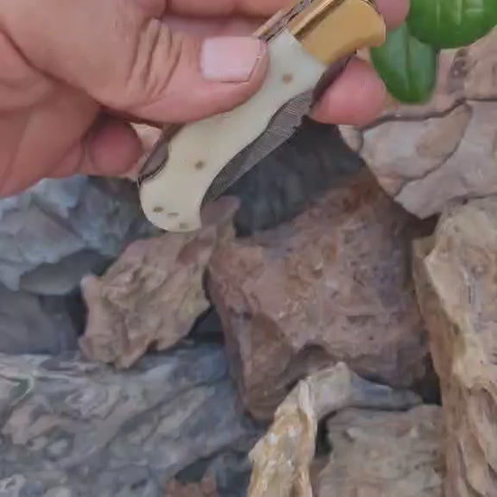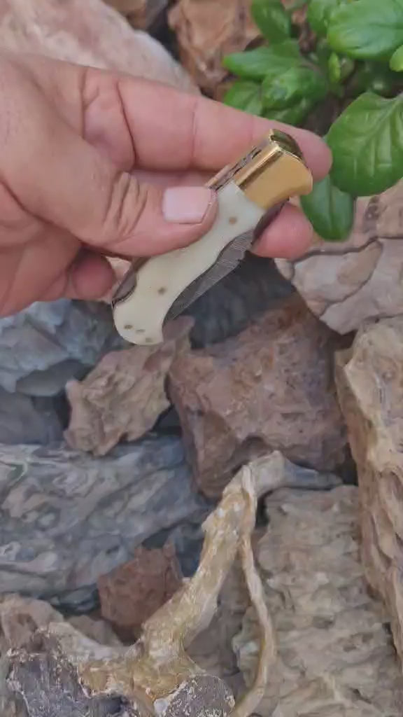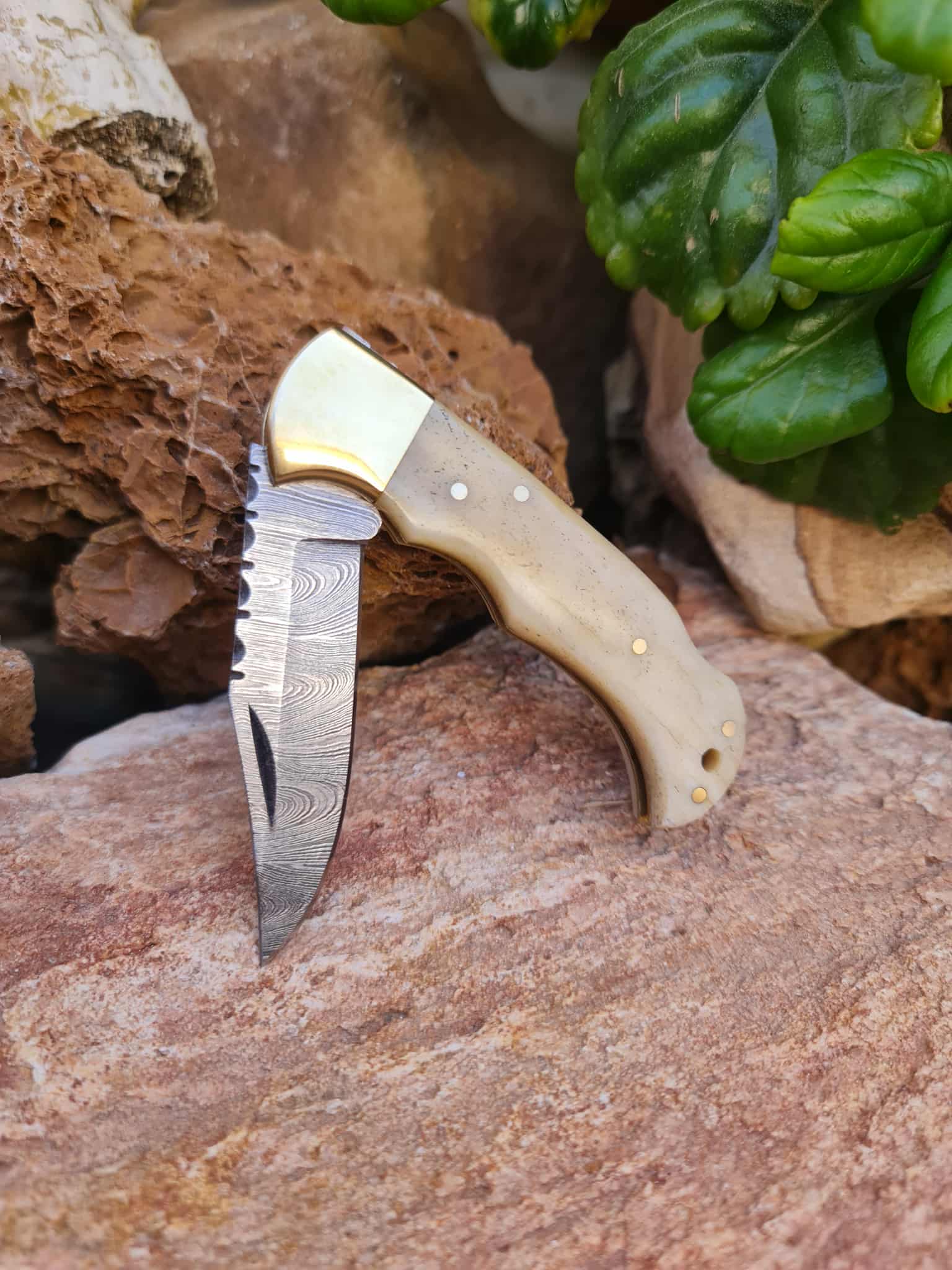 Handmade 17cm Pocket Knife with Damascus Steel - Camel Bone & Brass