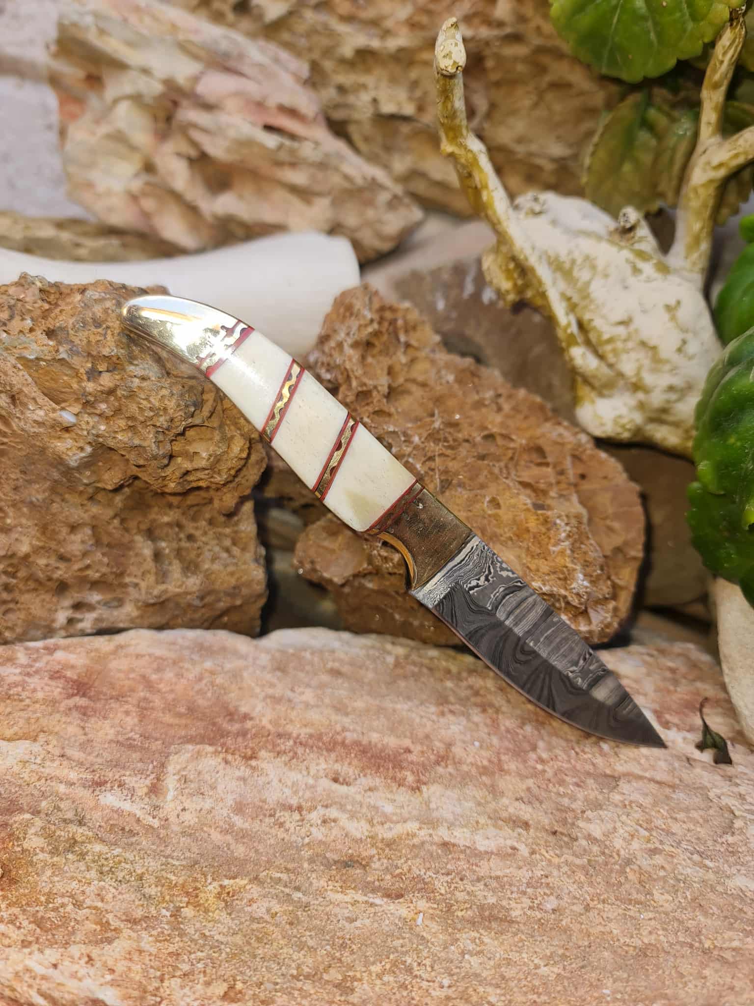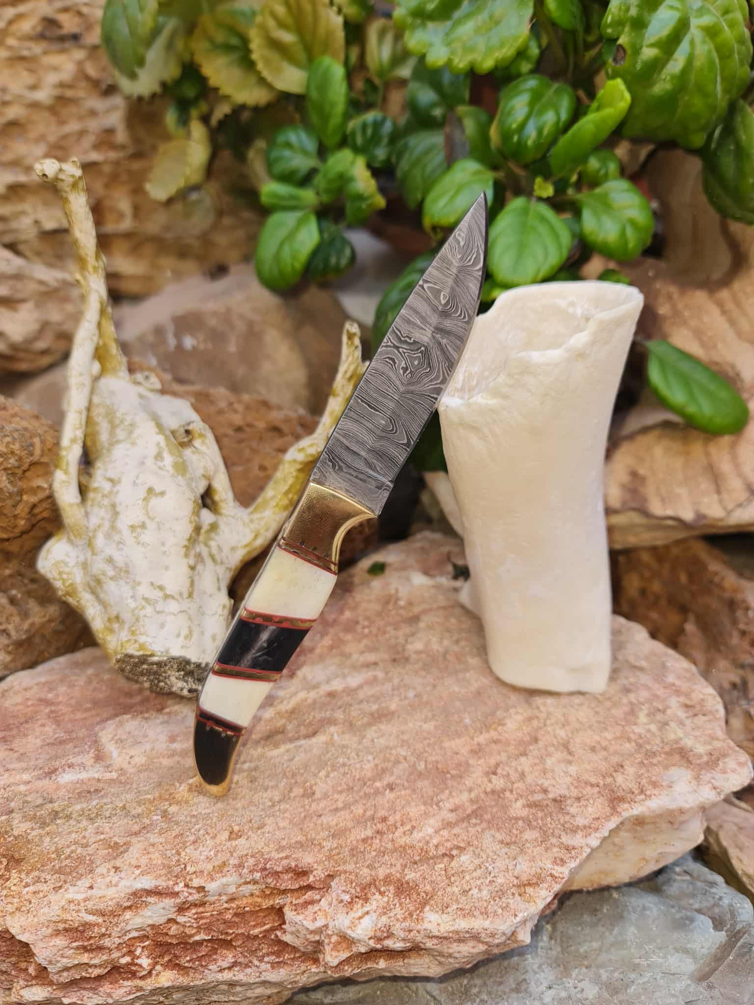 Handmade 18cm Mini Hunting Knife with Damascus Steel - Buffalo Horn - Camel Bone & Brass