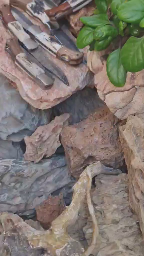 Handmade 19cm Pocket Knife with Damascus Steel - Red deer antler - Walnut wood & D2 Stainless Steel