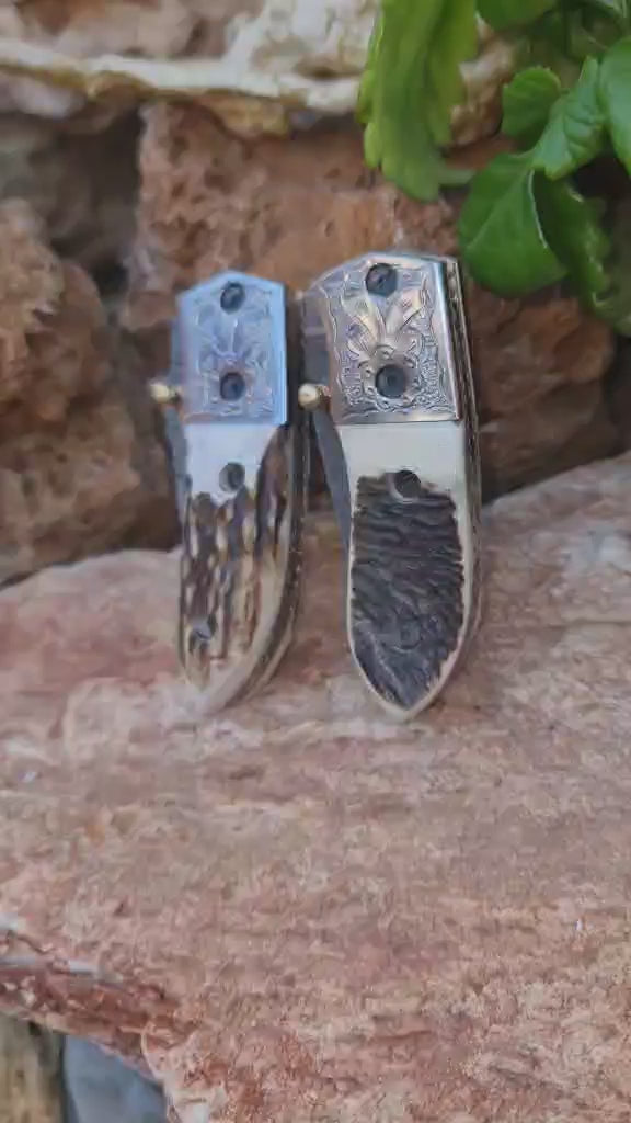 Handmade Limited Edition with Serial Number 16cm Knives with Damascus Steel - Red Deer antler & Hand Engraved Stainless Steel D2 (Exclusive Knife with Serial Number)