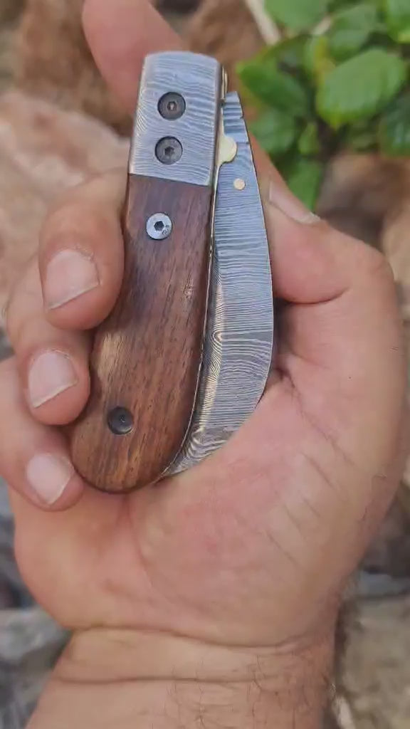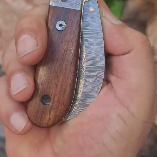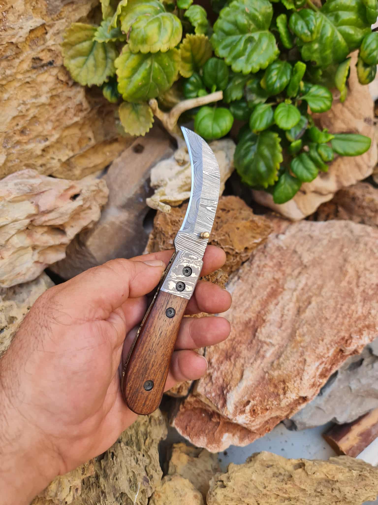 Handmade Hawkbill – 18cm Folding Knife with Damascus Steel & Walnut Wood