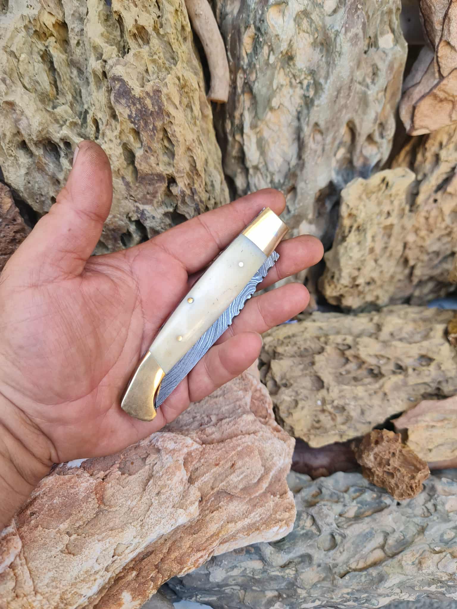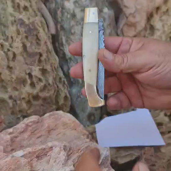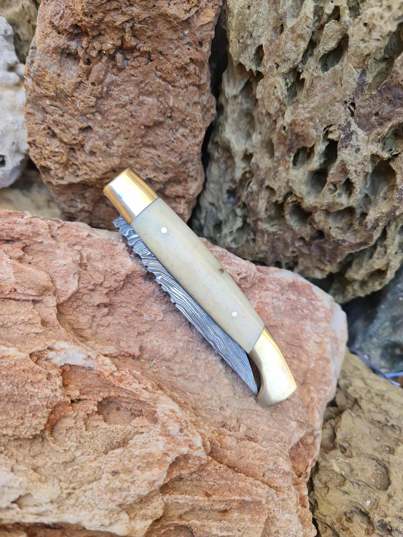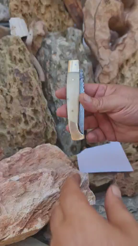 Handmade Resolza Pattadese – 23cm Italian Style Folding Knife with Damascus Steel - Brass & Camel Bone