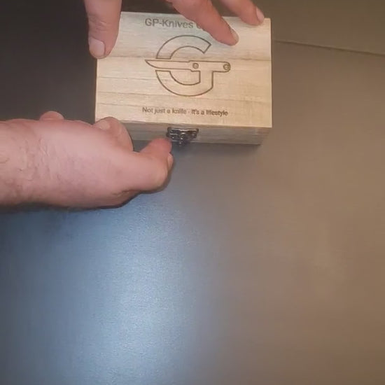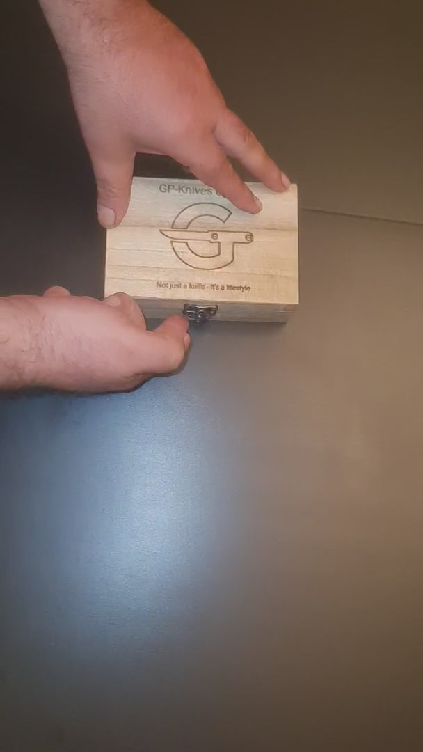 Presented in a hand-crafted wooden gift box (Z001 €10) with precision-cut EVA foam (box size: 15×10×5 cm, knife length: 18 cm), it arrives as a complete and impressive gift package.