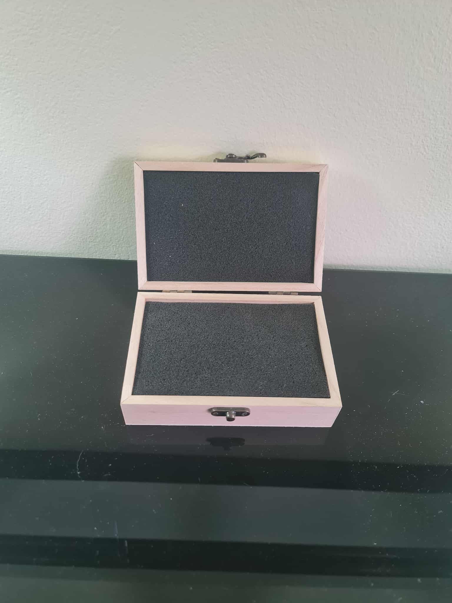 A beautifully crafted wooden gift box with EVA foam interior, designed to fit folding and pocket knives perfectly. The custom-cut foam holds the knife securely in place, highlighting its shape and making it stand out as a prestigious gift or display piece.